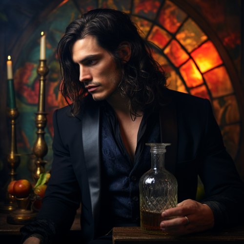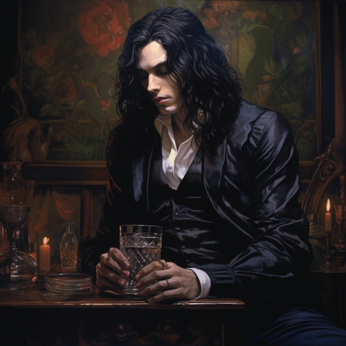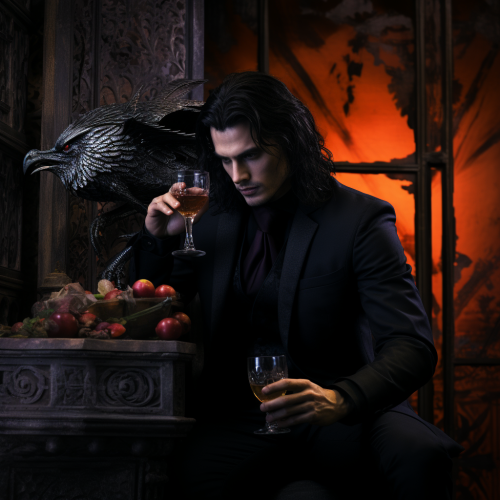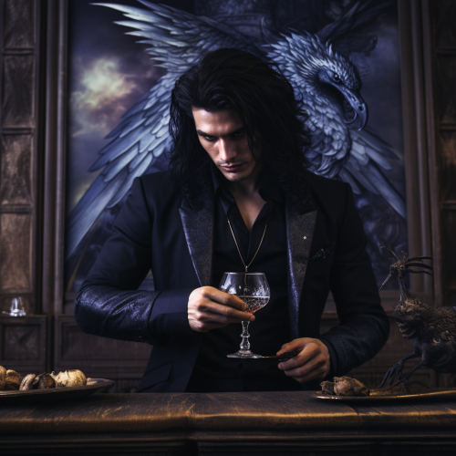 28-years-old handsome men, wiith black dragon wings, long black wavy hair, he's in black suit, magpie on his shoulder, old fashioned glass of whiskey in his hand, more colorful, toned colors, pure colors, aesthetic, detailed
