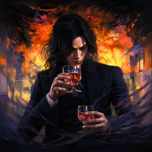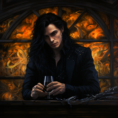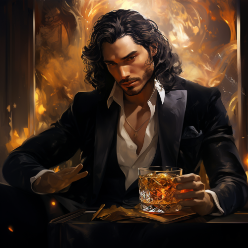 28-years-old handsome men, with black dragon wings, long black wavy hair, he's in black suit, old fashioned glass of whiskey in his hand, more colorful, toned colors, pure colors, aesthetic, detailed, digital art style, detailed art style