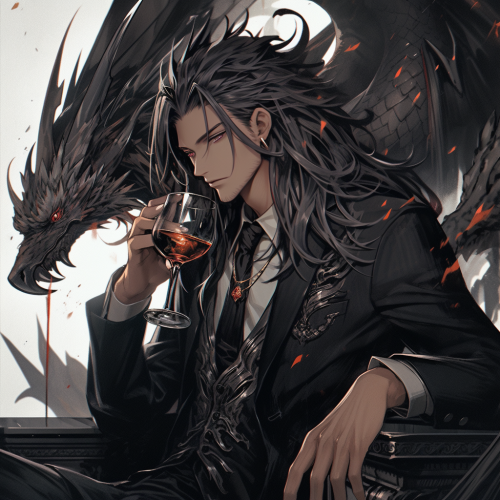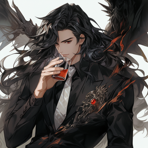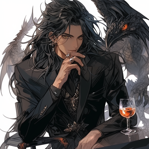 28-years-old handsome men, with black dragon wings, long black wavy hair, he's in black suit, old fashioned glass of whiskey in his hand, more colorful, toned colors, pure colors, aesthetic, detailed - @Sechra (fast)