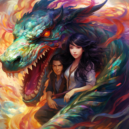 woman with long black curly hair and man with fine hair ride a colorfull dragon,anime,strong,colorfull,mistery