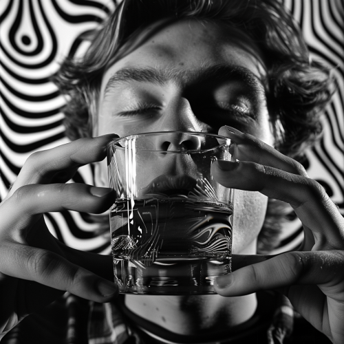 a futureretro black and white close-up photography of a young man sipping whiskey from an rocks glass, the glass is in front of his face, both of his hands are on the glass, and he's savoring every sip of whiskey and has closed eyes and is lightly smiling, 35mm, symmetrical, on an abstract op-art background, directed by Stanley Kubrick, op-art, neofuturism, cinematic shot