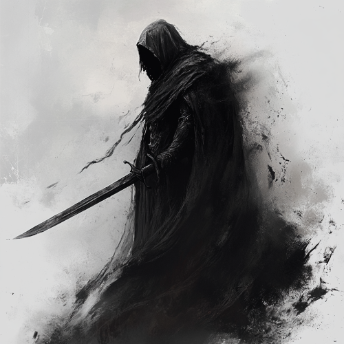 close up portrait of A shadowy hooded figure with minimal details, entirely covered in darkness, standing against a plain white background. The face is hidden, with only glowing eyes visible, creating an aura of mystery and secrecy. --v 6.1