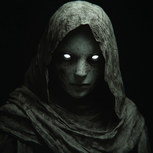 The image shows an eerie figure, likely female, with a pale, haunting face. She is wearing a weathered hooded cloak that shrouds her in shadows and a face mask. Her intense, glowing white eyes pierce through the darkness, giving her an otherworldly, sinister presence. The texture of her face and cloak suggests decay or something supernatural, with dark streaks around her eyes and a grim expression. The entire scene is set against a pitch-black background, enhancing the foreboding atmosphere and focusing attention on her ghostly features.