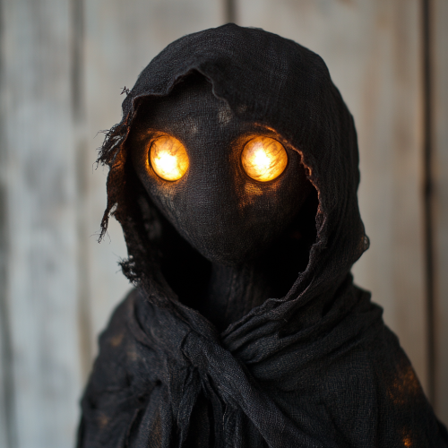 A mysterious, but not creepy, hooded figure puppet, clearly handmade and cloaked in tattered black cloth. The hood obscures their features, save for a pair of glowing eyes made from polished pebbles, carefully arranged to catch the firelight. not scary
