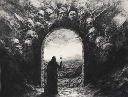 Charcoal drawing of a hooded figure holding a key, stood in front of an archway of solid black, surrounded by moorland. The sky is made up of faces of angels and demons. --ar 4:3