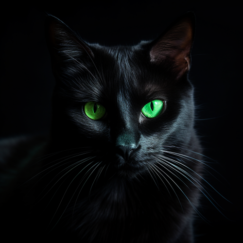 a mysterious and foreboding atmosphere surrounds a black cat with gleaming, emerald-green eyes. The feline's sleek, midnight-black fur contrasts sharply with its mesmerizing, almost otherworldly gaze. It crouches low to the ground, poised and alert, as if ready to pounce on unseen prey or disappear into the shadows. The verdant luminescence of its eyes seems to pierce through the darkness, imbuing the cat with an aura of ancient mysticism and superstition. Round light background.