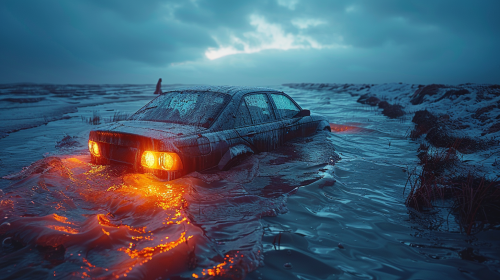 A car sinking in the water with its lights ON while a person from the shore with a hood on watches it sink in the middle of the night. ultra realistic photography 64K resolution, extreme high detail. --style raw --s 750 --ar 16:9 --v 6.0