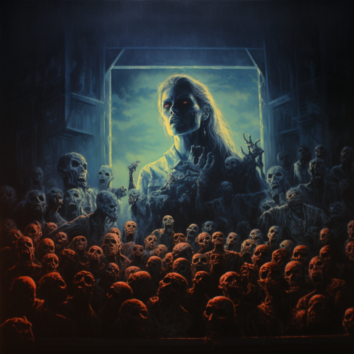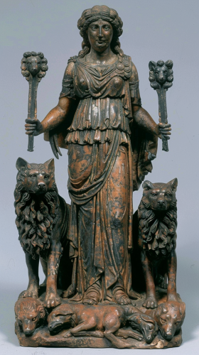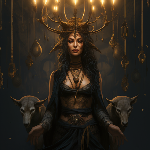 three headed greek godddess Hekate, with two black wolf dogs by her legs --ar 9:16