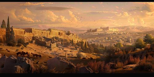 ancient plateu with trojan wall of troy in background --ar 2:1