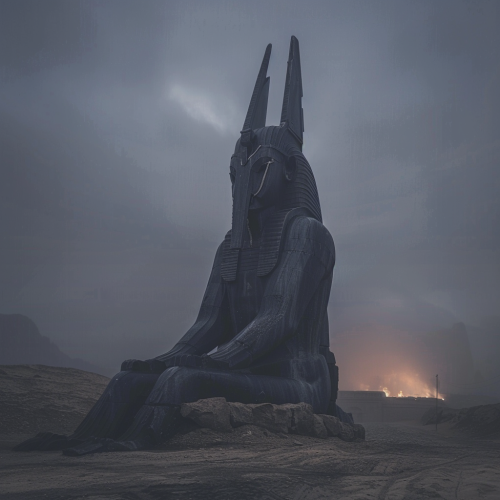 giant statue of a black anubis in the desert of egypt at night, horror ambience, fog, fire on the background