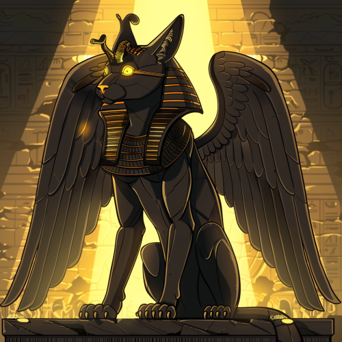 front pharaon egyptian sphinx winged statue, nineties style anime cartoon, standing up with yellow eyes lighting,