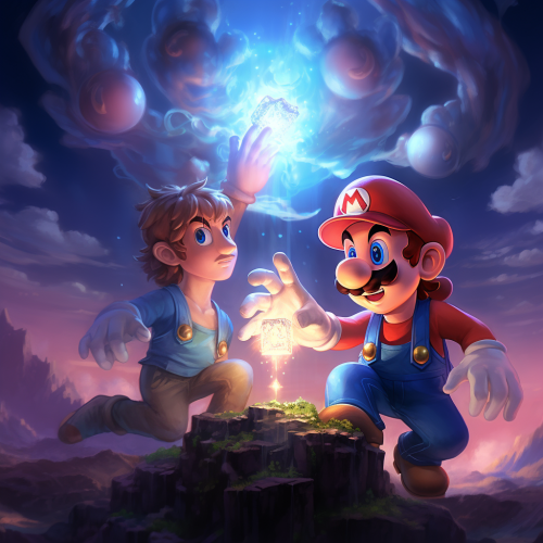 Scene 1: The Creation of a Magic Portal On a quiet afternoon, Mario and Luigi were repairing pipes in the Mushroom Kingdom. Suddenly, a mysterious glow appeared in the sky, creating a magical portal. Curious, the plumber brothers decided to investigate.