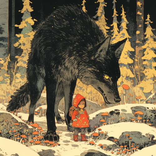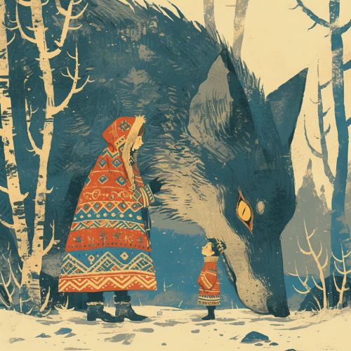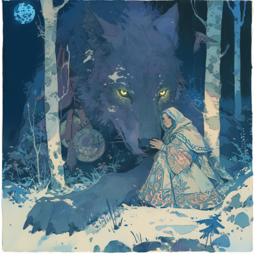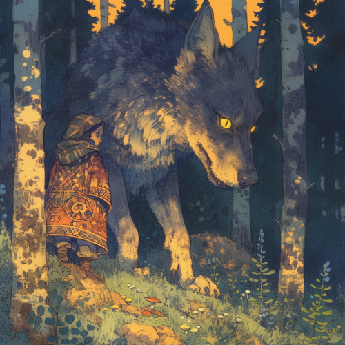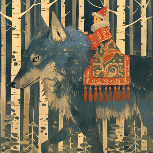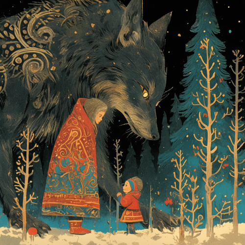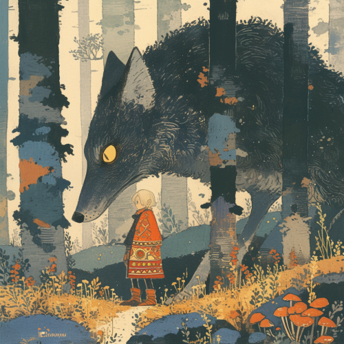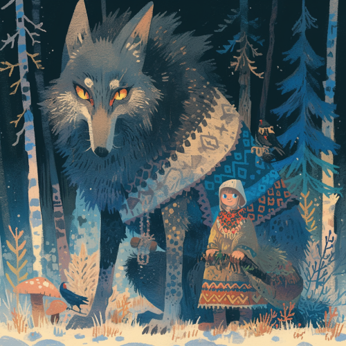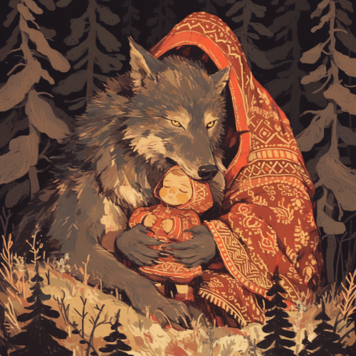 Mystical and gloomy illustration in the style of artist Ivan Bilibin. A large gray wolf with bright glowing yellow eyes, protects an infant boy in a red Russian caftan, boots and a hat with fur. All around is a dark impenetrable spruce forest, with thin twisted birch trees in the foreground. The overall style is inspired by Slavic folklore with a dash of fantasy and medieval symbolism --s 750 --niji 6