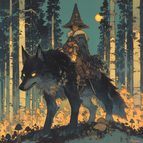 Create a dark, magical illustration in the style of Russian fairy tales by artist Ivan Bilibin. A big gray ferocious wolf, with big glowing yellow eyes, a Slavic boy rides on it. The wolf in a three-quarter pose walks through an old dark forest of interlocking spruce and thin birch trees. Lots of detail, mushrooms, moss, crows, clouds obscuring the moon. --s 750 --niji 6