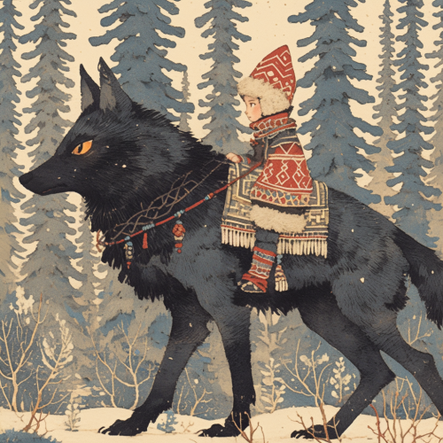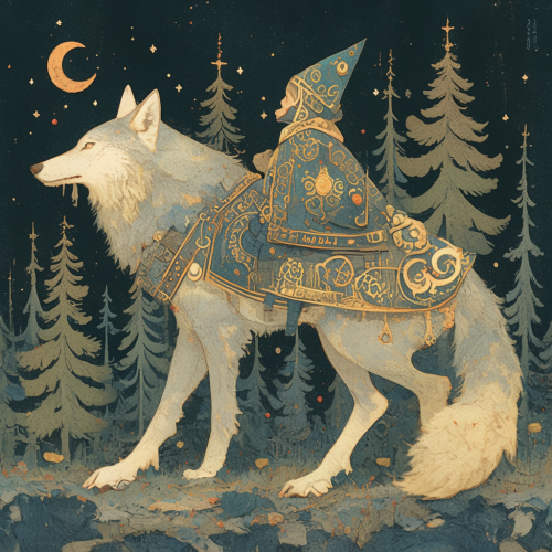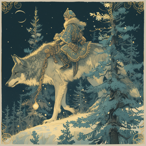 Мистическая и макабрическая иллюстрация в стиле художника Ивана Билибина. Большой серый волк с яркими светящимися желтыми глазами,скачет сквозь в густой елового леса, есть скоюченные тонкие березы. Верхом на волке едет мальчик малыш в славянском ярком костюме. На заднем плане изображены скрученные ветви елей и полумесяц, ярко сияющий в ночном небе. Общий стиль навеян славянским фольклором с примесью фэнтези и средневековой символики: детализированные узоры --s 750 --niji 6
