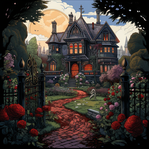 Illustration of a black Victorian manor, inspired by Malfoy's in Harry Potter, in the style of Ivan Bilibin. Surround the manor with a front garden filled with red roses.