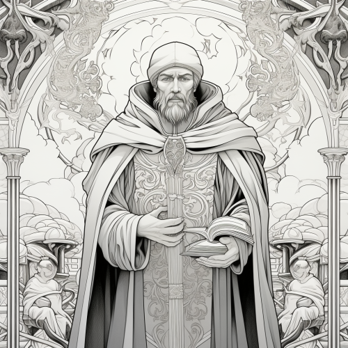 Dharma black and white colouring book page in Ivan Bilibin style borderless shadeless white background
