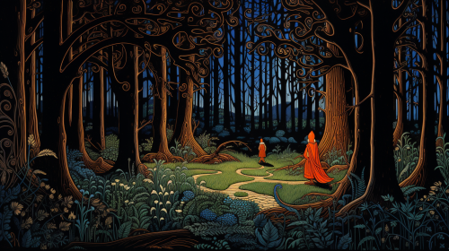 a fairy tale illustration of a woodwose, in the deep woods, dark, mysterious, fantasy, style of Ivan Bilibin, --ar 16:9 --s 50