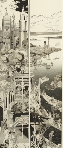 A monochrome cartoon collage page in Ivan Bilibin style borderless shadeless white background of a harbour filled with architecture students and families talking and interacting in the middle of the day, trees and vegetation from denmark, rule of thirds, geometric composition, symmetry, noise, numbers three and five composition, human perspective view, --ar 9:21