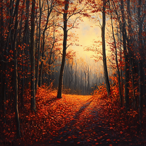 A crisp November evening in a scenic forest with golden and red autumn leaves, a path covered in fallen leaves under a cool sky with the sun setting low, warm orange glow reflecting on the leaves, slightly foggy for an atmospheric effect, detailed and realistic with high contrast.