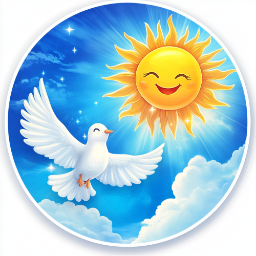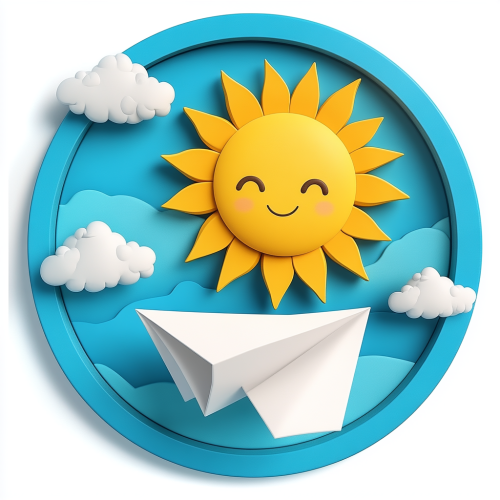 Design a 3D circular logo in a cartoon hand-painted style. The sun is in the upper right corner, yellow, with a smiley face. The paper airplane is white and flies towards the sun in the lower left corner with the wind. The background is blue sky and white clouds.