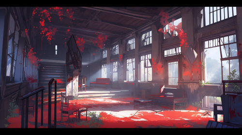 abandoned place taken over by nature with red stains on the floor --ar 16:9 --niji 5 --style scenic
