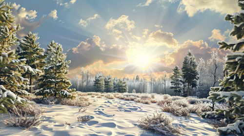 Nature in late February, beautiful forest, melted snow, sky with sun and clouds --ar 16:9