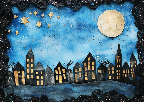 Beautiful blue night sky with stars and moon, black ribbon border, gold gilding, paper cutouts of silhouette buildings, layers, black lace trimmings, glittered glitter sequins, vintage watercolor, junk journal page, dark colors, high detail. --ar 97:69