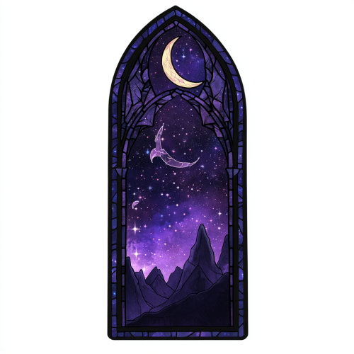 A sticker design die cut shaped as a long stain glassed window inspired by the Night Court from 'A Court of Thorns and Roses' book series. The design features an indigo and deep purple night sky as the background, with shimmering stars scattered across it. In the center, a glowing crescent moon is prominently displayed. Silhouettes of mountains, reminiscent of Velaris, appear at the bottom of the sticker, with stars twinkling above them. Stylized bat-like wings subtly blend into the night sky, symbolizing the Illyrians