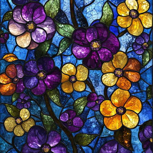 floral design pattern in the style of stained glass, tiny small flowers, purple, yellow, aqua hues vibrant colors and glitter details--ar 9:16 --v 6.1 --stylize 250