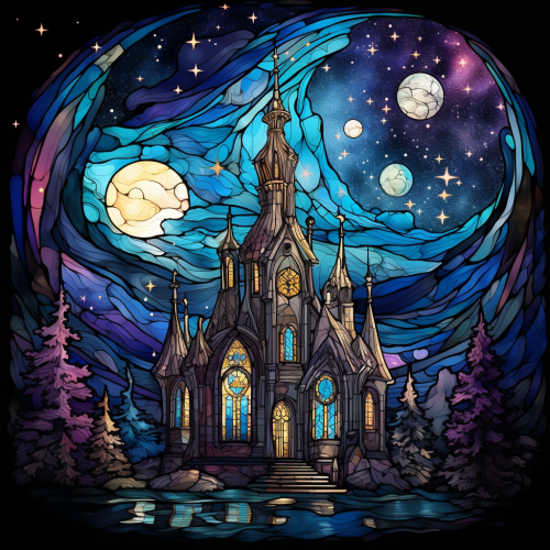 gothic style church, stained glass window, exterior, village night sky and stars designs on the building. fantasy art