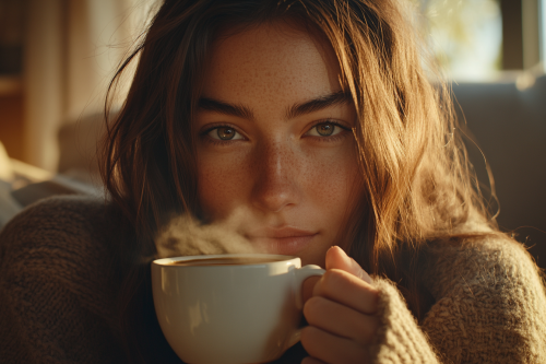 Close-up of a 30-year-old woman sitting on a cozy sofa at home, holding a coffee cup close to her face, steam rising from the cup, soft natural lighting highlighting her relaxed expression, warm-toned living room background, casual home attire, smooth skin with natural makeup, inviting and intimate atmosphere. Photorealistic, highly detailed, 8K resolution --ar 3:2 --v 6.1 --style raw