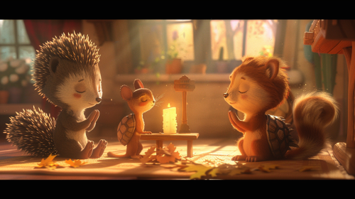 A sweet and heartwarming cartoon scene of a hedgehog, a turtle, and a squirrel praying to Jesus in a cozy home. The three animals are kneeling together in front of a small table with a cross and a candle, their eyes closed in peaceful prayer. The room is softly lit, with warm colors and simple furniture adding to the calm and serene atmosphere. The animals are drawn in a cute cartoon style, with gentle expressions and soft, rounded features, making the scene feel comforting and wholesome. --ar 16:9 --stylize 150 --v 6.0