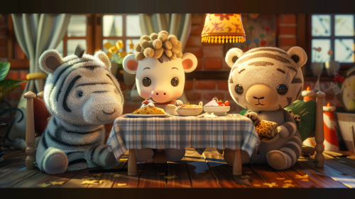 A cute 3D scene of a zebra, a bear, a sheep, and a tiger sitting together in a cozy home, eating a meal. The animals are depicted in an adorable, playful style with large eyes and soft, round features. They are sitting around a small table, each enjoying their food. The cozy home interior is filled with warm lighting, simple furniture, and charming details like curtains and potted plants. The 3D rendering is detailed, with the fur and textures of the animals looking soft and plush, adding to the overall cute and warm atmosphere. --ar 16:9 --stylize 150 --v 6.0