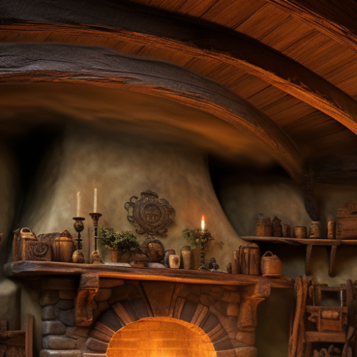 Imagine the cozy interior of Bilbo Baggins' bedroom, nestled within the tranquil confines of the Shire, as a tempestuous rainstorm rages outside. Visualize the warm, flickering glow of a fireplace casting a soft, golden light that gently illuminates the room, creating a soothing and inviting ambiance. Let the crackling fire infuse the space with a comforting warmth, providing respite from the chilly, wet night beyond the window. Outside, envision the window framed by heavy curtains, offering a view of the relentless downpour of rain, which cascades in diagonal streaks against the glass, distorting the outside world into a blur of dark shadows and shimmering droplets. The rhythmic drumming of the rain against the windowpane creates a soothing melody that permeates the room, adding to the cozy, intimate atmosphere. Include subtle details such as shelves lined with weathered books, the faint aroma of a hearty stew wafting from the kitchen, and the occasional flicker of a candle casting elongated shadows on the walls. Let the image capture the sense of security and contentment that Bilbo Baggins finds in the familiar comforts of his home, where the raging storm outside serves only to heighten the snug and inviting embrace of his humble abode