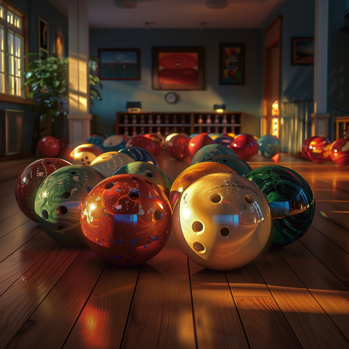 large collection of bowling balls on the floor of a room at home at night, photo realistic, high attention to detail, realistic, photography --v 6.0 --s 250