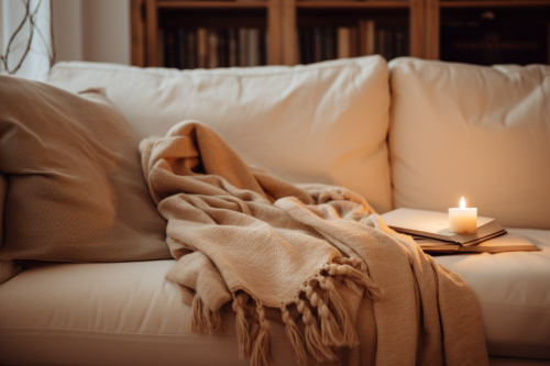 Warm and cozy living room in an American home, soft lighting, plush beige couch and a coffee table with magazines, subtle shadows, blurred background for a welcoming and comfortable feel in product mockups.