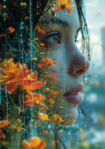 An ineffable Cyber futuristic Artistic narrative Cyber robototical image with Flower show, Yamaha SR400, Encryption, a Cyberrobotic style, and a Freeze-frame view --v 6.0 --c 15 --ar 25:35 --s 750