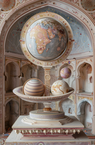 an ancient model with three planets and various constellations, in the style of spirals and curves, intricately mapped worlds, dissected books, light magenta and sky-blue, radiating lines, bibliographic anomalies, bold chromaticity, an old building with a flower design on ceilings under arches, in the style of contemporary indian art, petrina hicks, light crimson and light amber, zen buddhism influence, organic architecture, passage, siya oum --ar 29:44