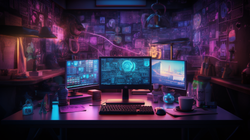 cyberattack, hacking, cybersecurity, dark purple, dark blue, pink, light blue --ar 16:9 --q 0.5 --s 250