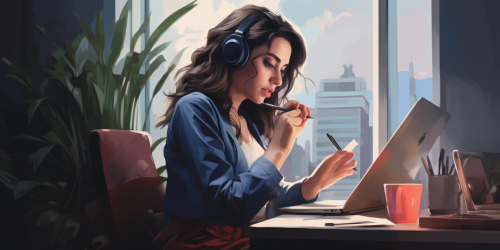 a hypermodern office of a lead generation company, a woman taking a phone call an writing notes in na notebook simultaneously --v 5.2 --ar 2:1