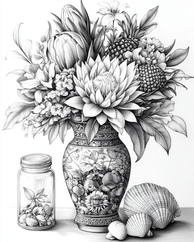 Create a black and white coloring page illustration of an arrangement of a variety of beautiful Hawaiian tropical with Proteas and large Anthuriums flowers and baby Pineapples and a variety of foliage all arranged in a tall Chinese Vase. The vase sits on a beautiful Victorian table with a glass jar of seashells and a large conche shell. Most of this image is white with clean and clear and crisp lines No shading or shadows on this illustration. The background is white. --ar 4:5 --v 6.1 --stylize 500