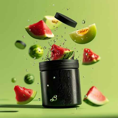 tall semi-slim black plain supplement tub with black lid 292g floating, tilted up slightly, chunks of honey dew melon and water melon in the air scattered around, all hovering in abstract vibrant space, wtermelon and honeydew colour theme, red, green, liquid, thirsty, sunshine, tropical vibes, bright contrasting light, stunning hues, wet, beads of condensation, motion, explosive, dynamic, freeze motion, dynamic product shot lighting, dramatic, product imagery, 50mm lens, dof background, immaculate, hyper realistic, canon 1dx camera, ar 9:16