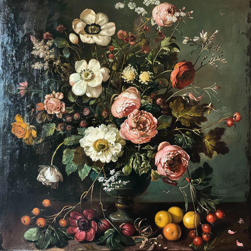 in the style of Fantin Latour painting, beautiful flower, Still life — 16:9