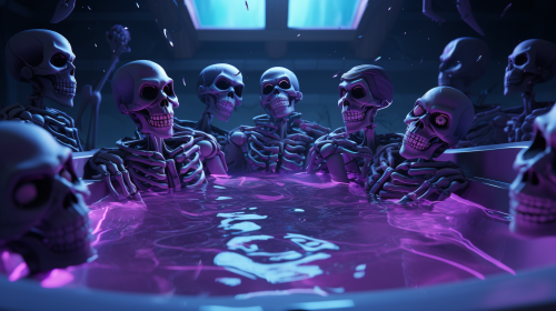hot tub full of fortnite skull troopers, 3d render, fortnite art style, funny cartoon --ar 16:9