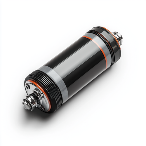 Photorealistic view of an electronic capacitor with two leads, viewed from above, slightly rotated, body color slightly lighter than black with a gray stripe, on a pure white background, no shadows --ar 1:1 --s 250 --style raw