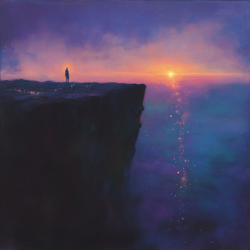 An ethereal landscape at twilight, where the horizon blurs into a gradient of soft purples, pinks, and deep blues. A lone figure stands at the edge of a cliff, gazing toward a radiant, glowing light in the distance. The light represents a distant goal or connection, shining with warmth and hope. Surrounding the figure are delicate, floating particles of light that drift toward the glowing center, symbolizing a journey or approach. The atmosphere is calm but charged with emotion, blending serenity with a sense of longing. Include subtle textures like mist or clouds, adding depth and mystery.