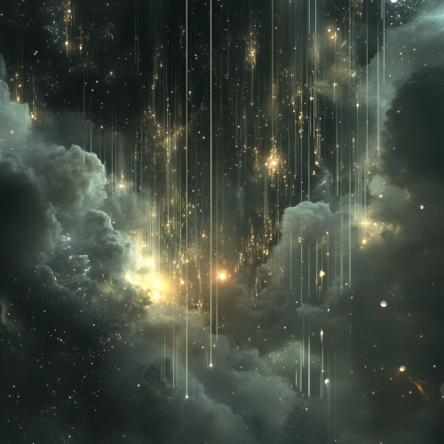 Extraterrestrial elements falling like rain, composed of glowing crystalline shards and small orbs of light, as though suspended in space. The fragments appear otherworldly, semi-translucent with a soft luminescent glow. These elements give a dynamic sense of motion, as though the space is alive and active, but still peaceful and harmonious. Soft, mist-like streams flow between the clouds and the falling shards, adding to the immersive, layered feel. The elements should be very close to the lens and the background should be plain, so that the elements could be easily isolated and added as the foreground to another image.