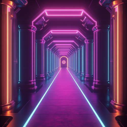 arabesque designed room, long hallway, intriguing path, symmetrical geometry on walls, light portal at end of hallway, mysterious, dark with neon accents, neon bright portal light, hyperspace,