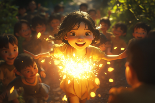 3d CGI animated image of a young girl named Wy-Wy glowing brighter than ever a bright golden light, leading a group of children out of the darkness with joy on their faces, very detailed, bright colors, childrens book image, cinematic lighting, --ar 3:2